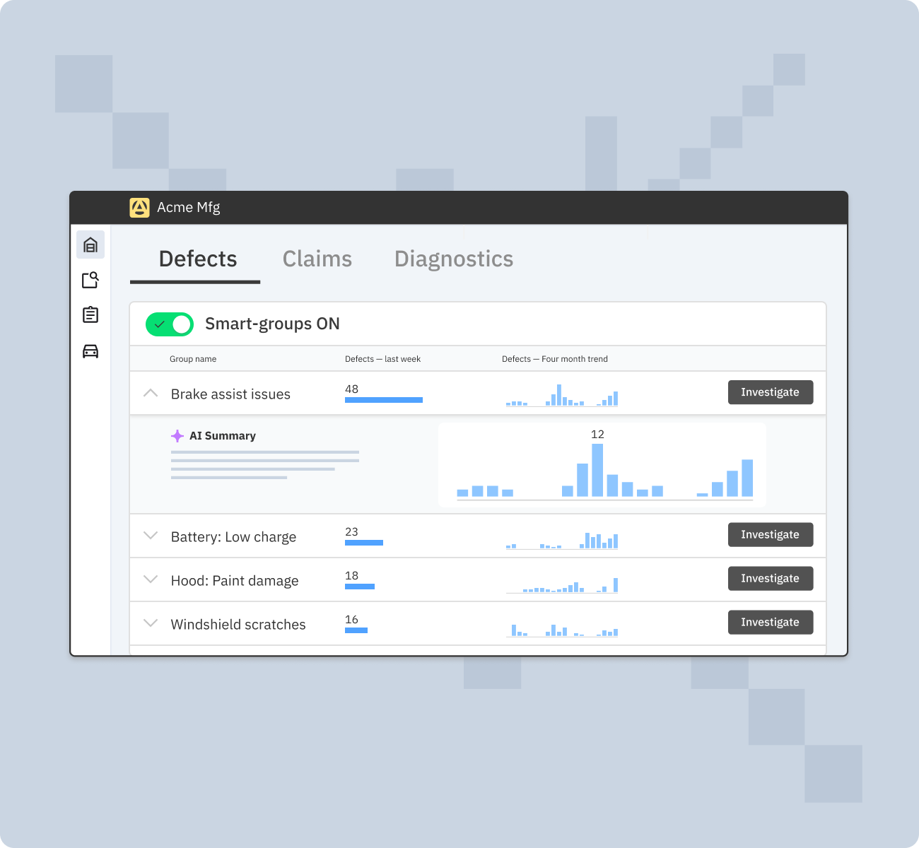 Identify hidden issues earlier with AI that automatically sorts your defects and claims into “smart groups”.
